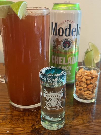 Place Michelada mix, Lemon and Lime and Ice into a large mug. You can rim the glass if you like.